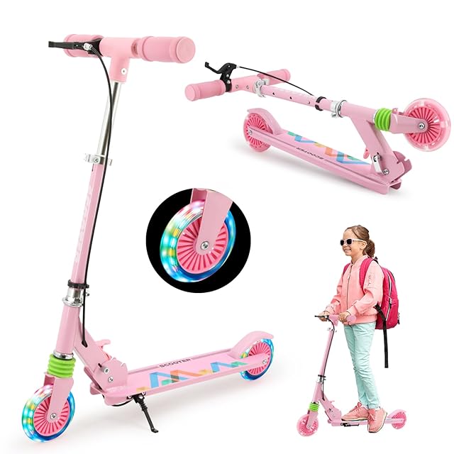 TENBOOM キックボード キッズスクーター キッズ 子供 新型ハンドルブレーキ付き 3~12歳子供用 2輪 LEDタイヤ 耐荷重50kg 幼児車 おもちゃ 折り畳み式 方向変換 ベビー プレゼント PINK, 桜色ブレーキ付き