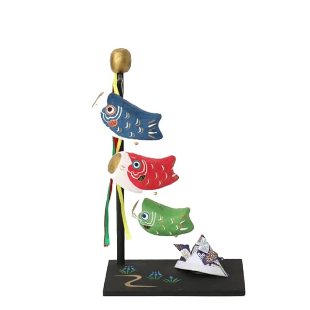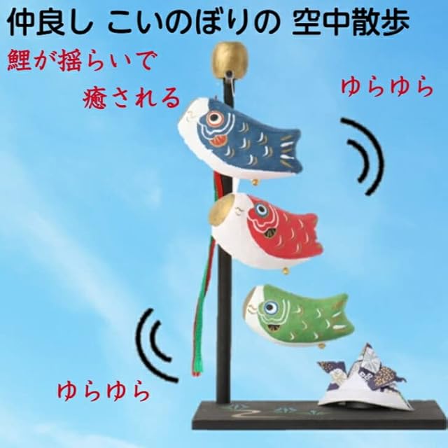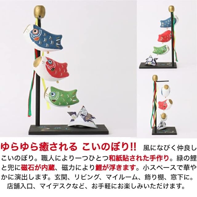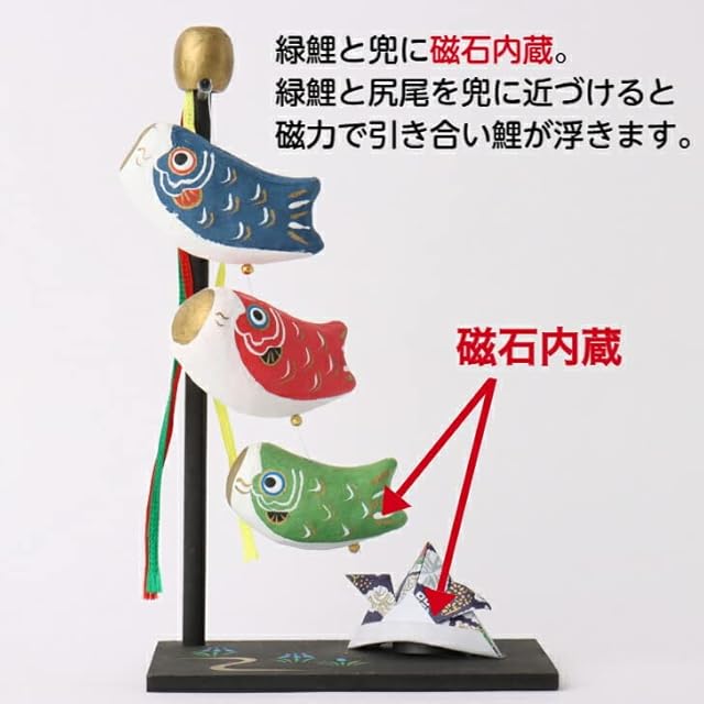 内容:張子こいのぼり3体が磁石で宙にぶらさがり。緑鯉と兜に磁石内蔵