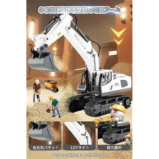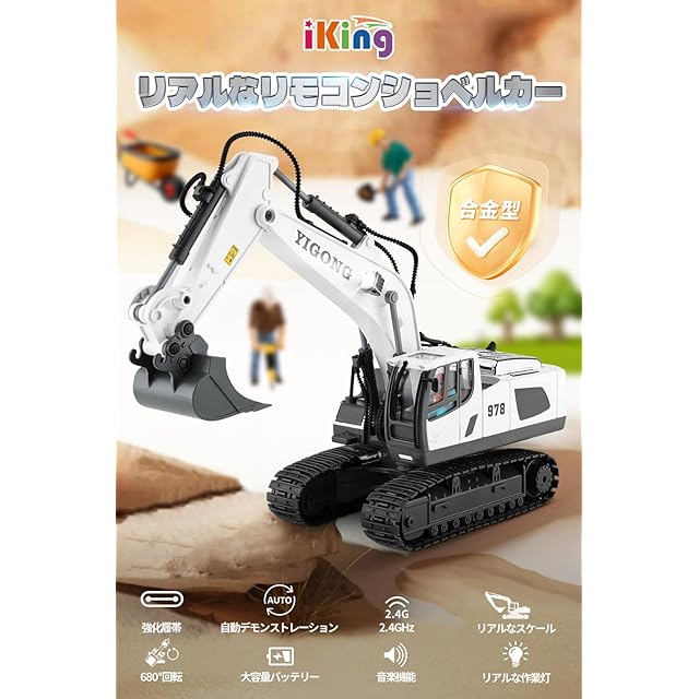 iKing ショベルカー ラジコンカー おもちゃ - 2.4GHz 掘削機 合金バケット LEDライト 360度/680度旋回 建設車両 砂浜 砂場 室内外遊具 車 男の子 女の子 プレゼント 子供用 リモコンカー USB充電式