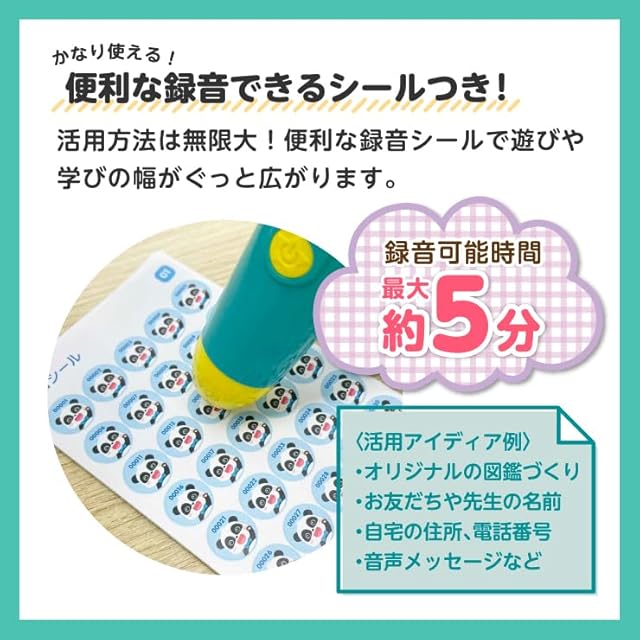 ●発語を自然に促す「録音・再生」機能つき タッチペンで特定のページをタッチすると、子どもの声を録音&再生!「ママ見て!自分の声が聞こえたよ!」と大喜び。声を出す楽しさから、自然に発語を引き出します。 さらに録音シール付きで、「キキのお名前を録音」「家族からの応援メッセージを貼る」など、遊び方は自由自在!