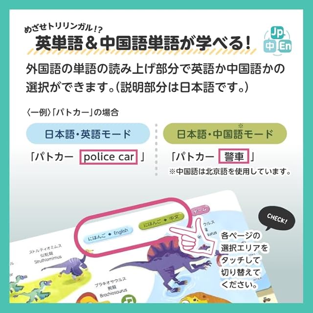 ●日・英・中の3か国語対応で、グローバルな耳を育てる ネイティブ音声の日本語・英語・中国語にワンタッチで切り替えOK。幼児期の言語インプットに最適です。
