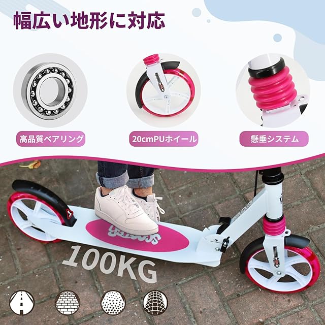 【高反発PU製のホイール】ホイール直径は8インチ(20cm)で、車輪の素材は耐摩耗性と耐荷重性に優れる高反発PUを採用し、走行中の音は小さく、振動感も少ない滑らかな走りです。少々のガタガタ道、凸凹道、砂利石で走行してもスムーズに走れます。乗り心地が抜群です。年齢を選ばず子供から大人まで楽しめます。