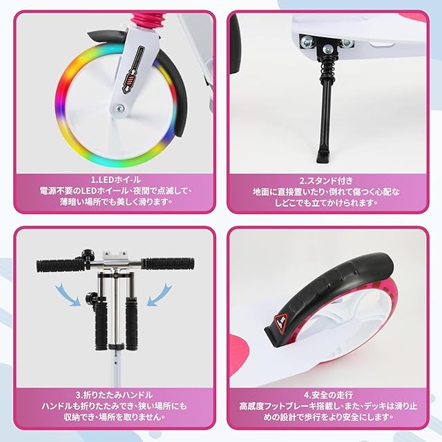 【滑り止めデッキ&2種ブレーキ】フロストデッキを採用し、ヤスリのようにざらざらなデッキで、幅も広くて足全体が収まできて、スピードを出して走行しても滑りにくい、最大限度に安定性を実現できます。フットブレーキ付きで、片足をブレーキにそっと置くことでいつでも停止でき、より安全に乗ることができます。