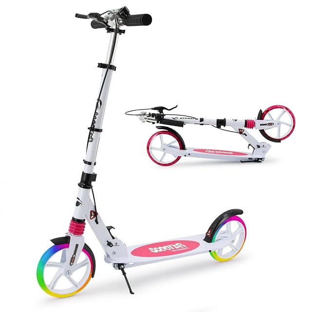 TENBOOM キックボード キックスクーター 子供/大人用 2WAYフット/ハンドブレーキ 折り畳み式 3段階高さ調整 20cmタイヤ 立ち乗り式二輪車 スタンド付き WHITE