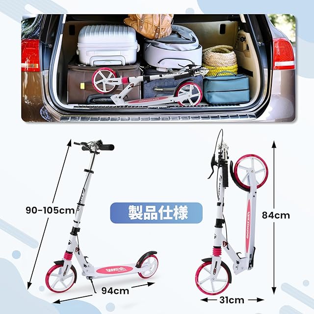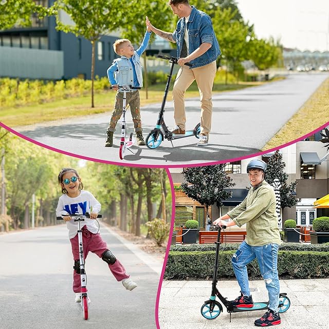 【高品質材料&3段階調節】製品は耐久性のあり錆びにくいアルミニウム製で、軽量かつ頑丈なボディのキックスクーターです。身長110cm以上の子供と大人兼用で、88cm、95cm、102cmの3段階に調節でき、身長が大きくても小さくても使用できます。