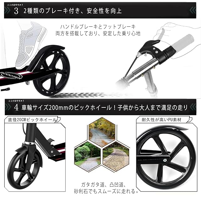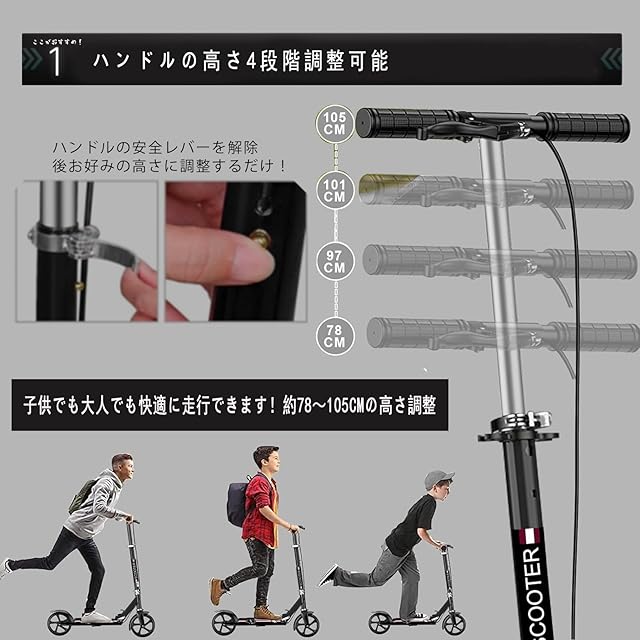 ✩【4段階調整】キックボードのハンドルは約76cm/94cm/99cm/105cmの4段階に調整でき、耐荷重は150kg、大人の方も安心して乗れる丈夫な作りで、幅広い年齢層に適用しています。お子様から大人まで楽しめます!プレゼントとしても最適です。安心に快適な走りを体感し、何年にわたっても使用に耐えます。