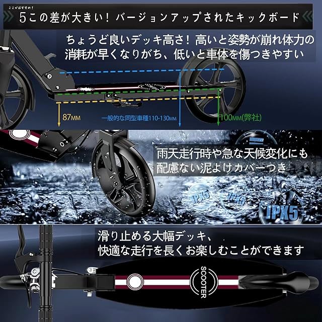 ✩【1台あればみんなで遊べる】キックボード本体は軽量で頑丈なアルミボディを採用。デッキ面が滑り止め加工を施したことで、安心で快適な滑りをサポートします。身長の大きな方でも安定する大幅のデッキと、大人の手でも握りやすい長さとグリップ性が強いラバーグリップで乗り心地に特化した、移動に便利なキックボードです。