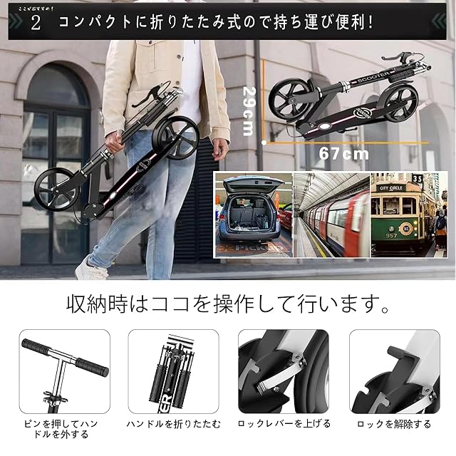 ✩【折りたたみ式】コンパクトに折り畳み式で、持ち運びやすい!出先でも置き場所に困らずとても便利です。行楽やちょっとしたお使い等に重宝する折りたたみキックボード。スペースを取らず、コンパクトなので、玄関などの室内保管や車のトランクに置いても問題ないです。 自立可能な折りたたみ式スタンドを装備し、置き場に困りません。