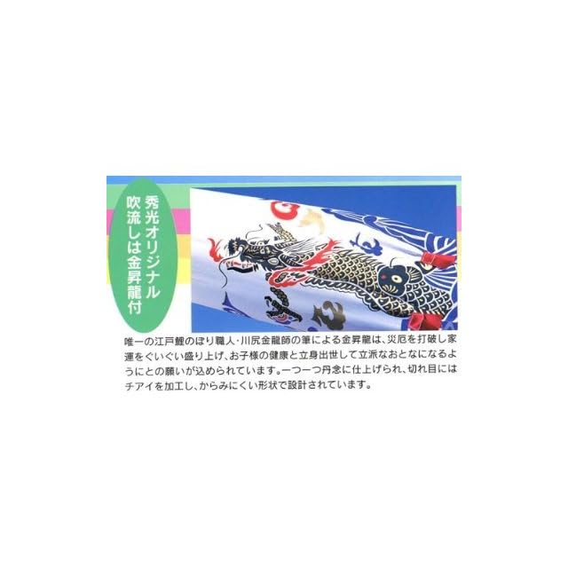 秀光人形工房オリジナル! 東京で唯一軒の手描きの出来る鯉のぼり職人『川尻金龍』作の金昇龍吹流し付、鯉セットです。