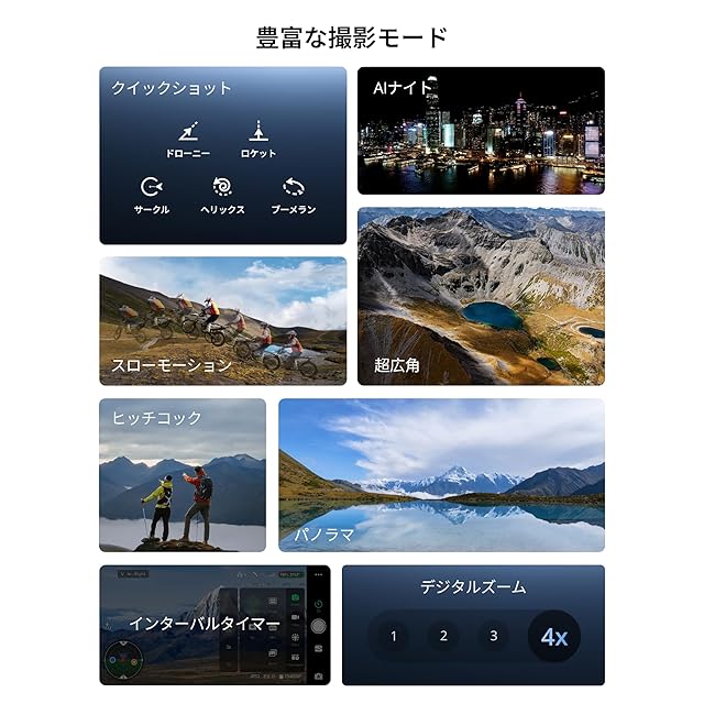 【AIトラッキング・AIスマート撮影】パラレル/フォーカス/追尾の3つのAI追従モードがあり、任意の被写体をロックオンして自動追従飛行を行うことができ、手動で飛行制御しなくてもプロ級の映像が撮影できます。また、ヒッチコック・ドローニー・ロケット・サークル・ヘリックス・ブーメランなどのAIクイックショート機能も搭載しております。