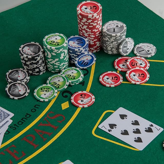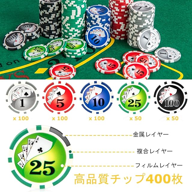 【高品質チップ♪】5色のチップ(白100枚、赤100枚、青100枚、緑50枚、グレー50枚)で面額を区別しやすく、フィルム層、複合層、鉄層の組み合わせで長持ちします。