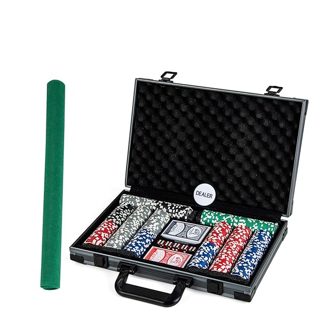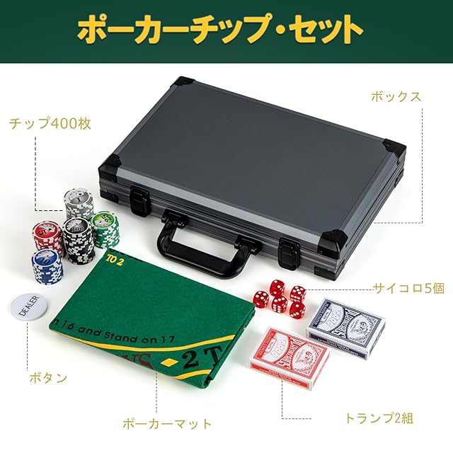 【完全なカジノセット♪】400枚のチップ、1つのディーラーボタン、2デッキのトランプ、5個のサイコロ、1枚のポーカーフェルトが付属。すべてが頑丈な鍵付きケースに収納されているため、安全で持ち運びも簡単です。
