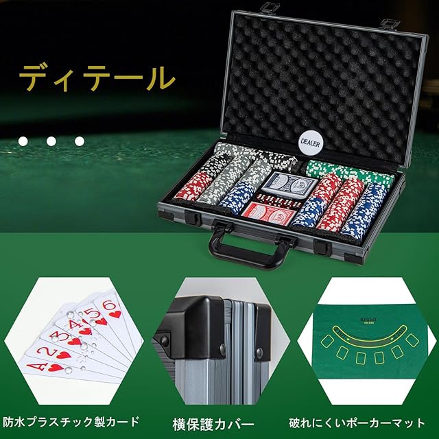 【幅広い用途♪】防水のカードと引き裂きに強いポーカーフェルトが付いており、高級感あふれるデザイン。カジノの夜、家族の集まり、屋外活動など、あらゆるシーンで楽しめます。どんなポーカーファンも喜ぶプレゼントです。