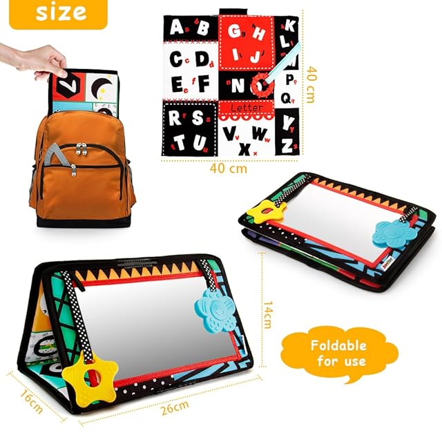 【軽量でポータブル】赤ちゃんにぴったりの床に置いて遊べる鏡のおもちゃです。 赤ちゃんが鏡を見やすくするために、下から角度を調整する必要があるかもしれません。赤ちゃんは鏡の中で自分を見ることができます。 旅行中は、車のシートに掛けることもでき、赤ちゃんの注意を引き付け、赤ちゃんが退屈しないようにできます。 折りたたんでバッグに入れられます。