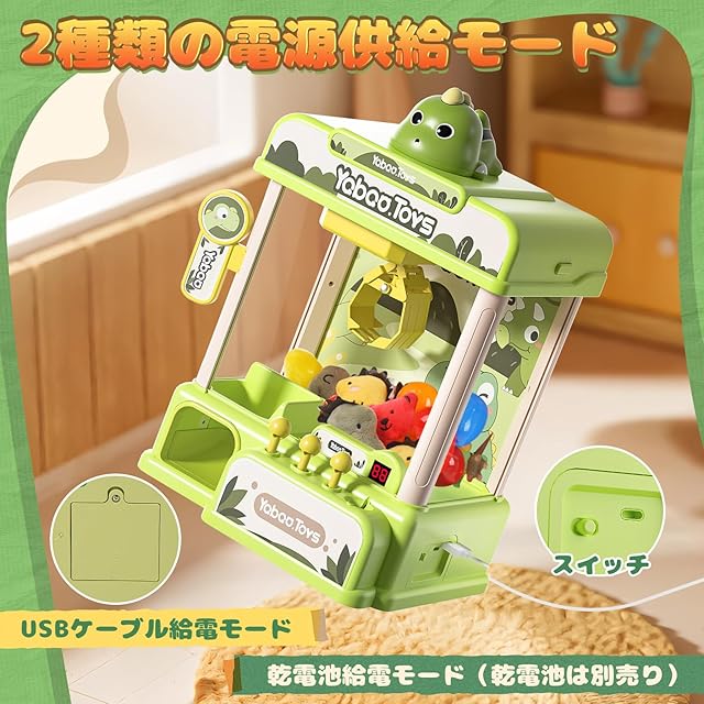 【可愛い恐竜クレーンマシン】リアルな恐竜デザインが特徴で、恐竜好きの子どもたちに大人気!アーケードさながらの本格操作が楽しめ、3つのジョイスティックでクレーンを自由に操って、恐竜ぬいぐるみやかわいいおもちゃをゲットできます。ご自宅で「恐竜世界」の冒険が楽しめます!