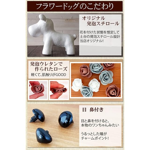 ウレタン製のバラの花で作ったフラワードッグです。目と鼻付きでよりリアルに仕上げました。軽く扱いやすいので、おうちのインテリアや犬好きさんへのプレゼントにもおすすめです。