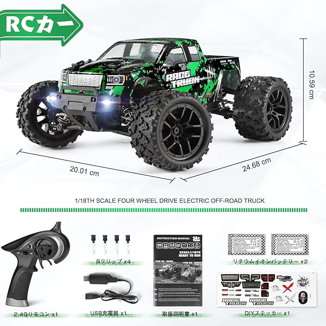 ラジコンカー HBX ラジコンカー オフロード 1/18 4WD RTR 電動RCカー 2.4Ghzリモコンカー 40 km/h 高速車 RCバギー オンロード 二つのスピードモード オフロード レーシング ロッククローリング オールテレーン防水トラック 付属のバッテリーと充電器 愛好家や初心者へのギフトに最適です(グリーン) 日本国内認証済み