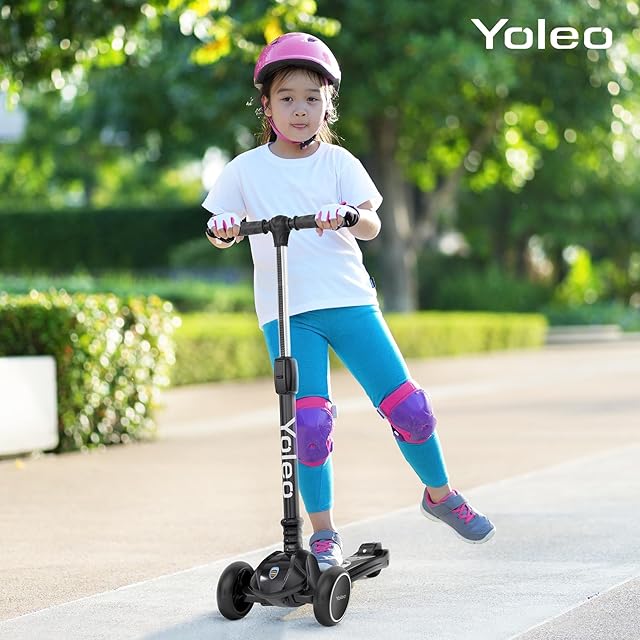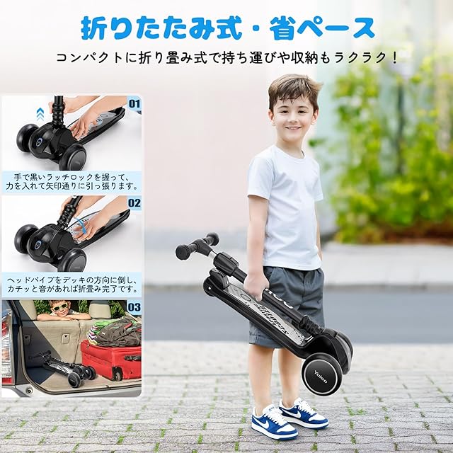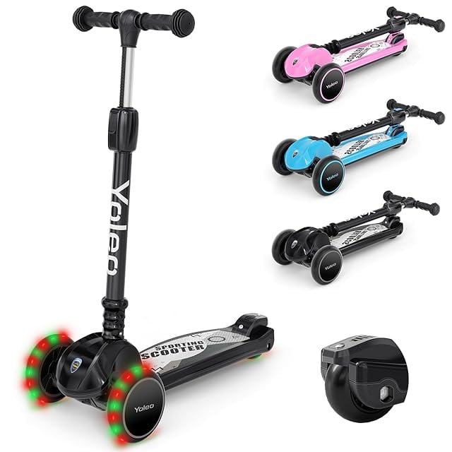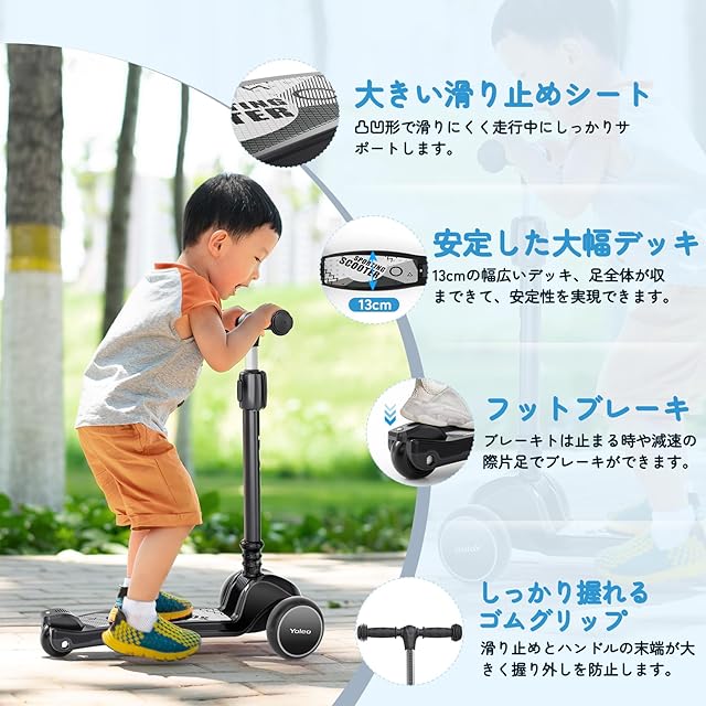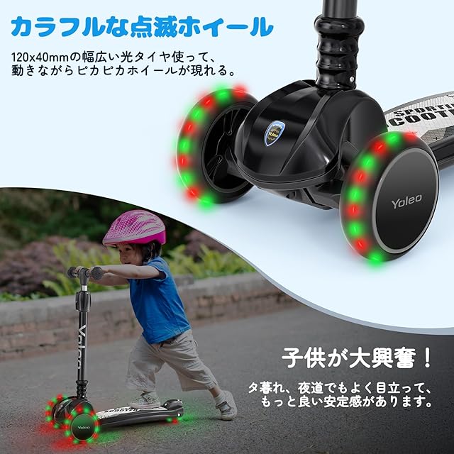 【無段階高さ調節x軽量で頑丈】YOLEO キックスクーター 折り畳み キックボード子供 三輪車 光るLEDタイヤ 後輪ブレーキ 3輪タイプ 方向転換 キックスケーター 誕生日プレゼント 完成品 コンパクト ギフト設定 (ブラック)