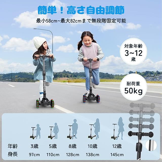 【高さ自由調節】子供の身長により、最小58cm~最大82cmまで無段階固定調節できます。子供の身長と商品実際のサイズを確認お願いします。適用年齢:3歳〜12歳。