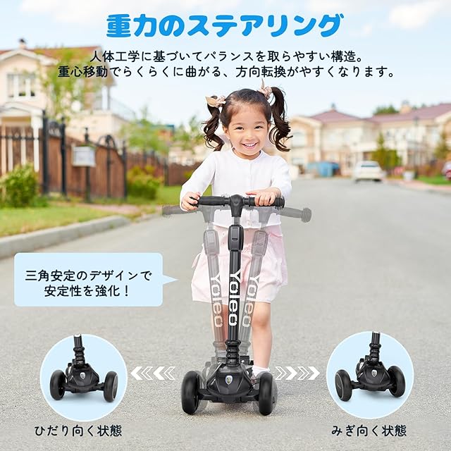 【方向転換しやすい】このキックボードは重力のステアリングを加えて、重心移動でらくらくに曲がて、方向転換がやすくなります。さらに、子供の体のバランス力を鍛えることもできます。操作性を高めることで子供の転倒を未然に防ぎます。