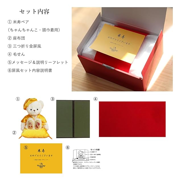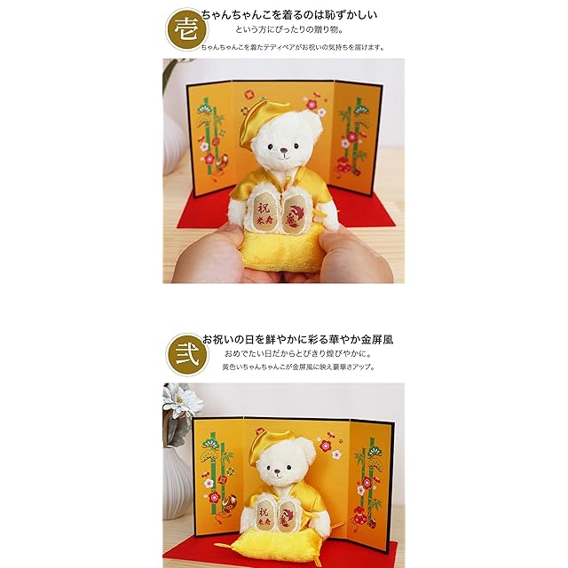 セット内容:べア(ちゃんちゃんこ、頭巾着用)、座布団、屏風、台紙(緋毛氈)