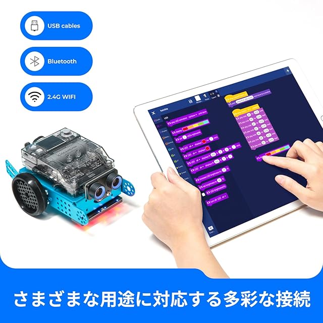 【簡単に使える】ステップバイステップのガイドに従って、mBot2プログラミングロボティクスキットを最初から組み立てます。mBot2には8つ以上のモード(ドライブ、描いて走る、ミュージシャン、音声制御、コード、ビルド、WiFiなど)があり、アプリを通じて遊べます。シンタックスを気にせずにブロックを使ってコーディングできます。1回の充電で最大5時間のプレイタイムを楽しみ、Bluetooth、USB、WiFiの切り替えが可能です。mBot2ロボットキットをいつでもどこでも使用できます。
