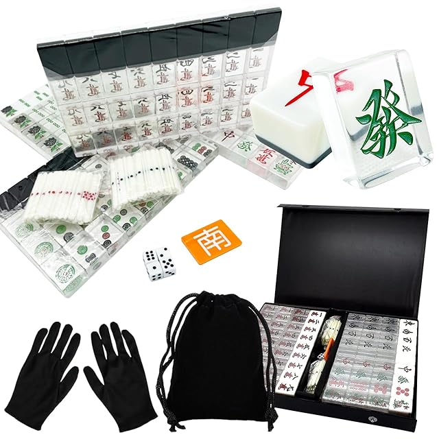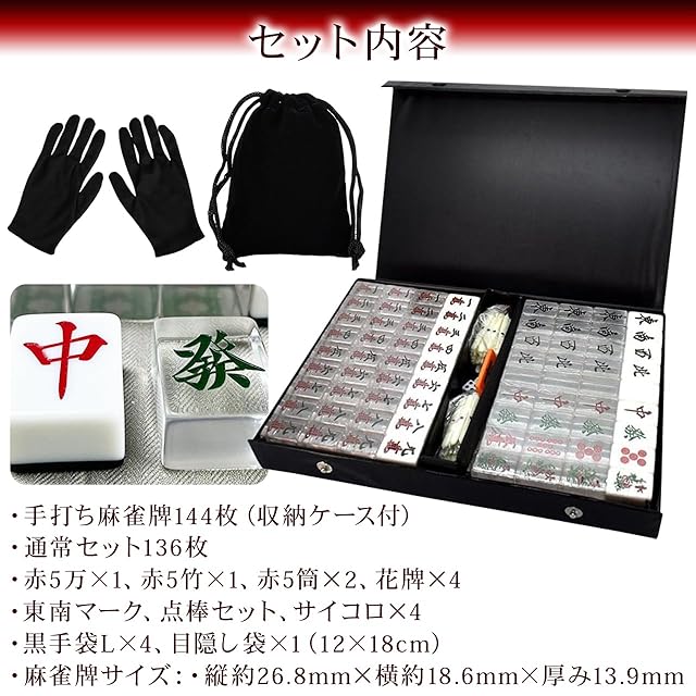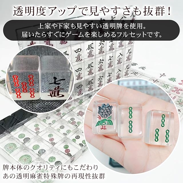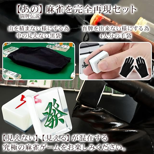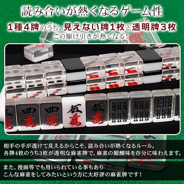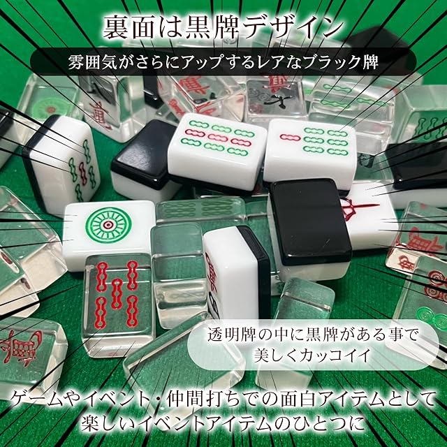 【麻雀牌・黒】透明麻雀牌 1種4牌のうち3牌が透明な特殊牌 標準サイズ (目隠し袋、黒手袋4人分、専用ケース付き) レア色 裏黒牌 BLACK