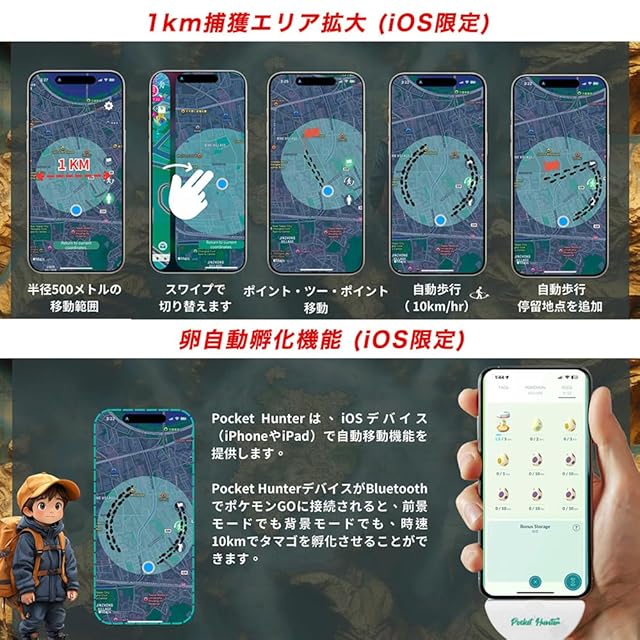 ✅【冒険を次のレベルへ!iOS専用の捕獲エリア拡張機能】「Pocket Hunter」のiOS限定の捕獲エリア拡張機能は、スマホのGPSを利用して直径1kmの移動範囲をカバーし、スワイプ操作で簡単に切り替え可能です。ポイント・ツー・ポイント移動や時速10kmの自動歩行機能に加え、停留地点の追加も可能。さらに定点プレイでもその効果を発揮し、特定の場所にいながら効率的にゲット!捕獲量が大幅に向上し、最大10倍以上の成果が期待できます。外出中でも休憩中でも、もっと楽しく、もっと効率的にプレイできます!