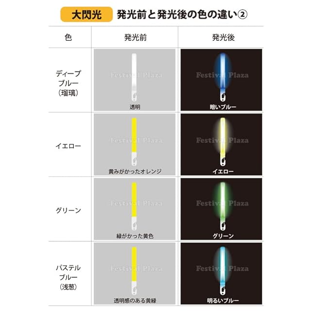1曲完全燃焼!すっごくまぶしいルミカライト♪ライブ、イベント会場をファンタスティックな光で演出するコンサートライトの決定版!★国内最高級品質の発光体(サイリューム)、ルミカ社の商品となります。同サイズ商品としては、明るさ・発光時間・消費期限どれをとっても国内最高級品質となります。★高品質のルミカ社の商品は氷点下以上の気温なら光ります。ノンブランド(ルミカ社以外)ですと、通常気温が18度以下になると、著しく発光しにくくなってしまいます。光らない場合もあります。★気温が氷点下の場所ですと、中の薬品同士の化学反応が遅くなりますので、発光時間は延びますが発光力は落ちます。逆に暖かい場所だと反応が早くなり発光時間は短くなりますが、常温でのご利用であれば特に光らない等の問題はございません。