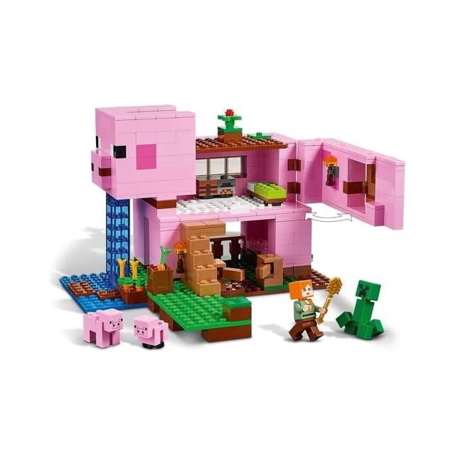 ブタの形のおうちとゲームに登場する大人気キャラクターアレックス、お馴染みのクリーパー、2匹のブタ、そしてアレックスの着せ替えパーツとブタの大好物ニンジンが付属しています。