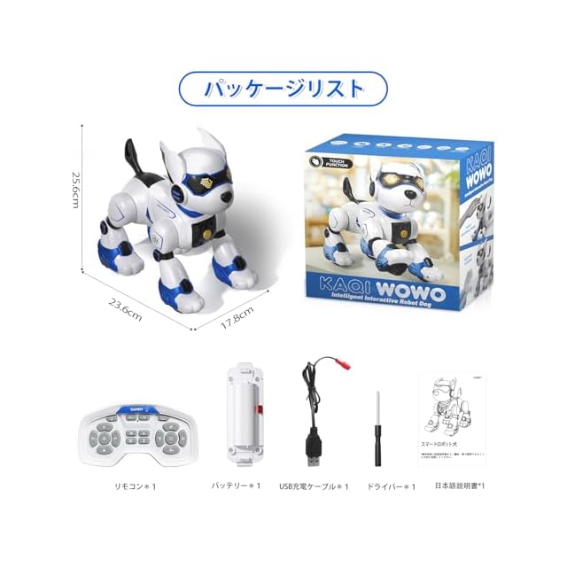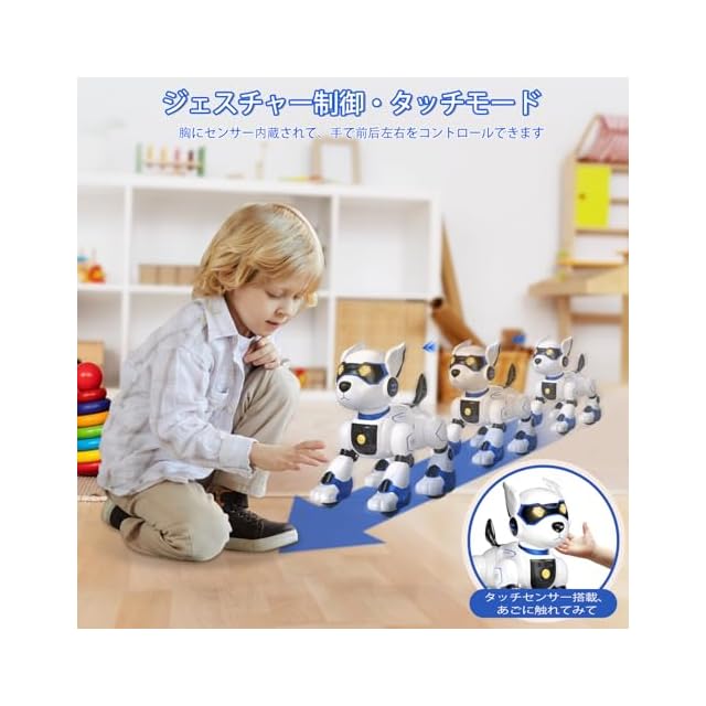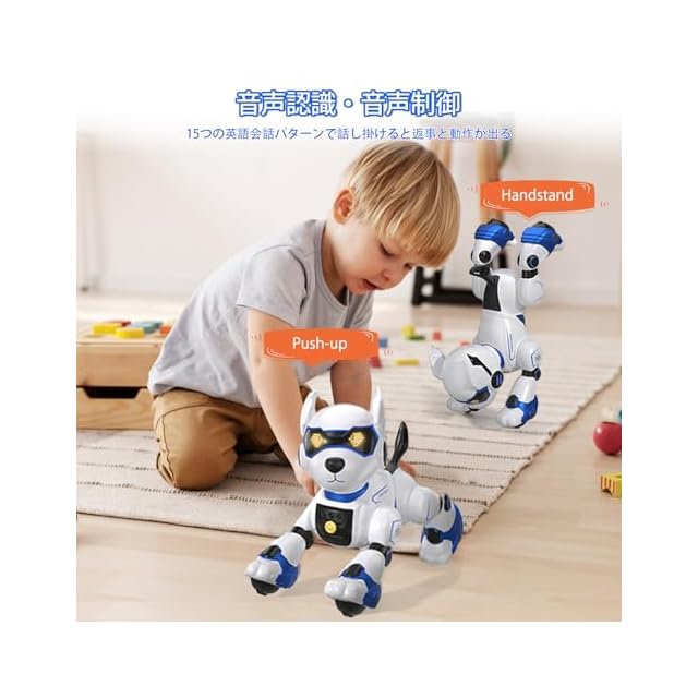 【3つの制御方法】①:リモートでコントロールし、リモコンは2本の単四電池必要です,(ご注意:単四電池は別途購入です)。②:ジェスチャー制御可能、胸にセンサー内蔵されて、手で前后左右をコントロールできます。③:音声制御/音声認識(英語のみ):ロボット犬は15つのコマンドがあり、説明書の簡単な英語指令に照らして話し掛けたり、呼んだりすると、ロボット犬が答えて対応な行動をします。そしてストーリーも述べます。子供たちにリアルな体験を提供し、簡単な英語の聞き取りも練習になります。