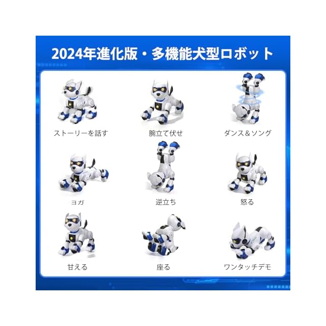 【多機能犬型ロボット】新登場の進化版多機能の犬型ロボットおもちゃは、前后左右、ダンス、ソング、音声制御、手振り制御、リモートコントロール、10種動物の物真似をする、甘える、怒り、逆立ち、腕立て伏せ、お座り、ヨガ、スリープ、吠える、プログラム機能、タッチモードなどの様々な機能搭載です。操作は簡単で、初心者にお勧めです。(日本語説明書と英語説明書付属)