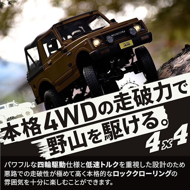 【本格4WDの走破力で、野山を駆ける。】WPLはクロスカントリー車、またはロッククローラーなどと呼ばれる、オフロードを走行することを前提として設計。パワフルな四輪駆動仕様と低速トルクを重視した設計のため、悪路での走破性が極めて高く本格的なロッククローリングの雰囲気を十分に楽しむことができます。
