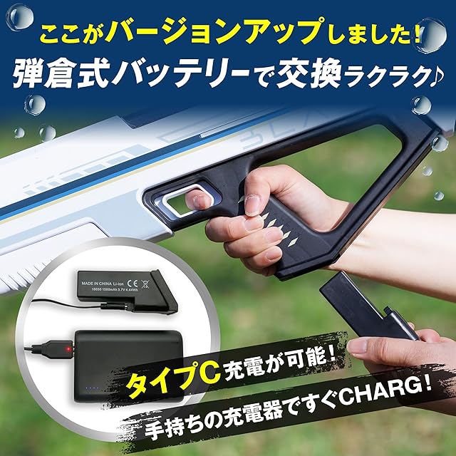 【遊びを止めない!3つの継続機能】 ①まさかのバッテリー切れも、手動発射モードで最後まで戦える! ②弾倉式バッテリーはワンタッチ交換!予備(別売)があれば即復活! ③さらに!給水口にペットボトルを繋げば(※)、タンク容量を大幅UP可能!長時間のバトルも、もう心配ありません! ※ペットボトルの飲み口の形状・サイズによっては適合しない場合があります。