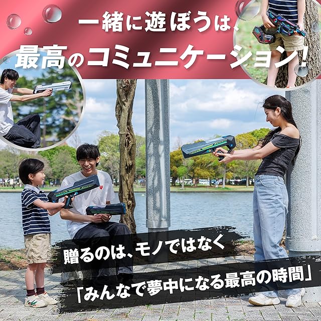 【撃つのが、快感!止まらない電動連射!】 トリガーを引けば、指先に心地よい振動と共に水流が途切れることなく発射!レスポンスの良い電動連射が、水遊びをもっとアクティブに、もっとエキサイティングな体験へと変えてくれます。この爽快感、一度味わうとやみつきに!