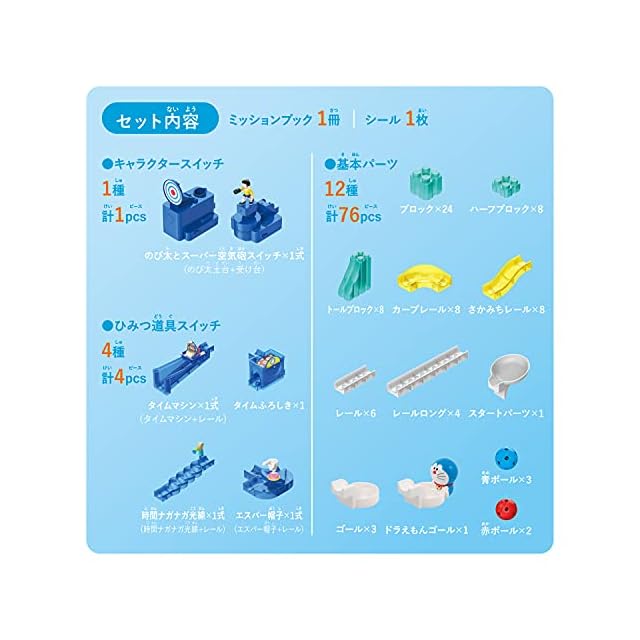 セット内容:のび太とスーパー空気砲スイッチ×1式、ひみつ道具スイッチ×4種、基本パーツ12種 計76pcs ミッションブック1冊 シール1枚が入ったボリュームたっぷりのセットです。