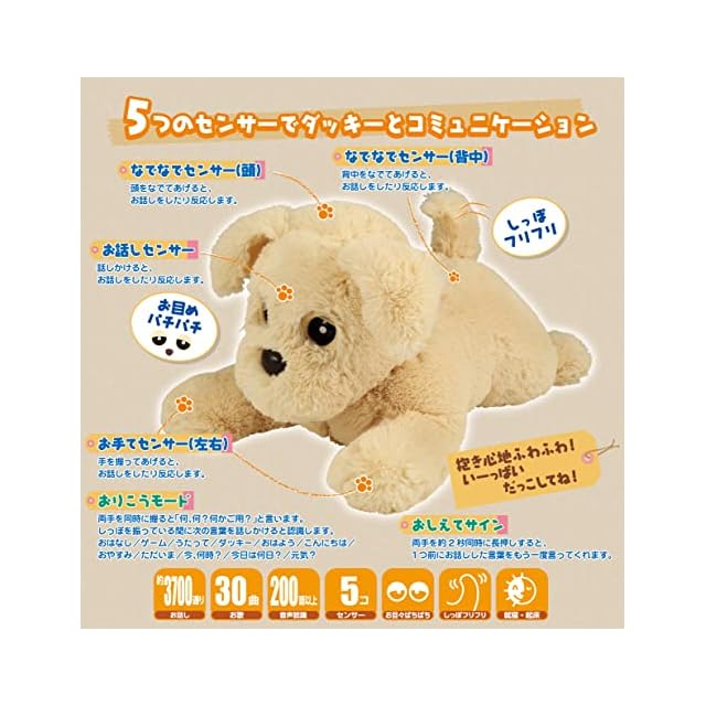 5つのセンサー搭載(お話しセンサー、左右お手てセンサー、頭なでなでセンサー、背中なでなでセンサー)