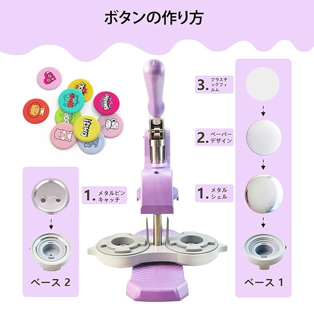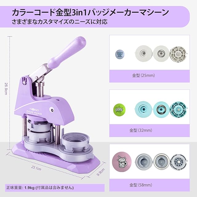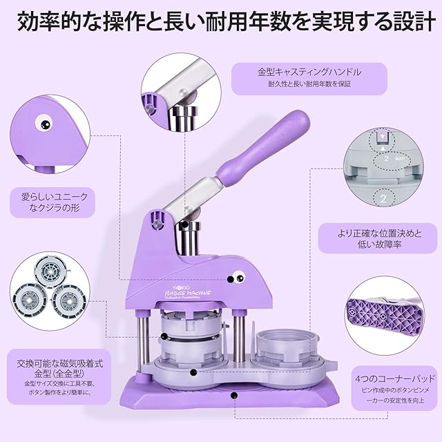 YiiYiiGO 缶バッチマシーン、缶バッジマシーン、革新的な磁気吸着機能、 3サイズ、25 / 32 / 58mm、缶バッチ素材300セット付属、缶バッチメーカー、パープル