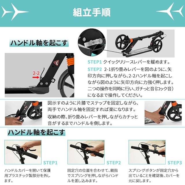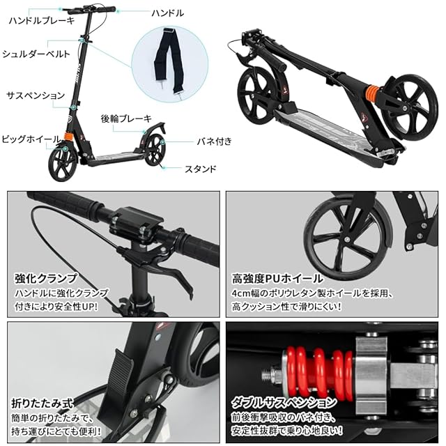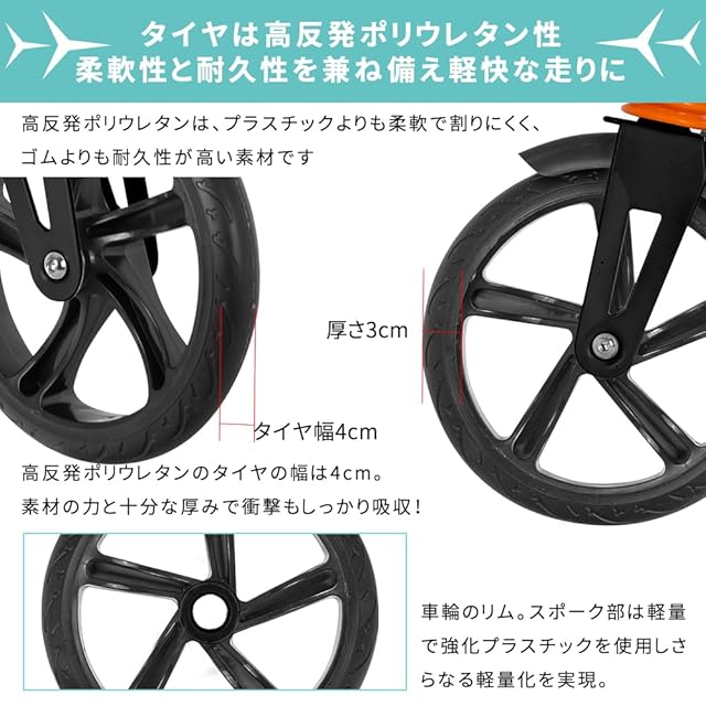 【安定性抜群】20CM直径、大きなホイールなので、転倒しにくく、回転がスムーズになります。道路( 歩道)の小さいな段差もつまづくことなくストレスなく乗れます。前後輪にサスペンションつき、しっ かり衝撃吸収します。安定感UP!!