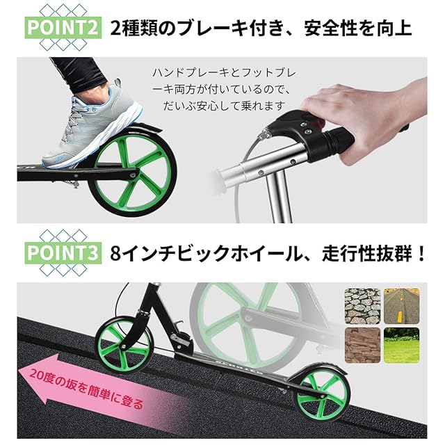 【快適な走行性】ホイール直径は8インチ(20cm)で、一蹴りで速く俊敏に走り、少々のガタガタ道、凸凹道、砂利石でもスムーズに走れます。乗り心地が抜群です。年齢を選ばず子供から大人まで楽しめます。大人も満足の乗り心地キックスクーター。【保証付き】キックボードにつきましては、何か問題があれば、最初に当店に連絡してください。必ず全力を尽くして問題を解決いたします。