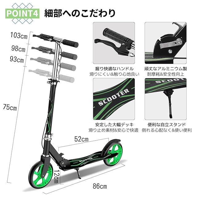 【4段階高さ調節】75、93、98、103cmの4段階の高さに調整できます。子供用としても大人用としても、お子様の成長にあわせて乗り始めからキックボードを卒業するまで楽しく遊べます!幅広い年齢層に適用しています。自分用はもちろん、プレゼントとしても最適です。安心に快適な走りを体感し、何年にわたっても使用に耐えます。