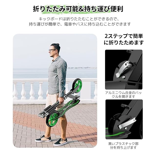 【折り畳み式キックボード】折りたたむことによってキックボード自体がコンパクトになるので、お部屋で保管できるので盗難の心配はなし。持ち運びはやすく、電車やバスに持ち込め、駐輪場などを気にしなく、通勤、通学、買い物などにおすすめします。女性でも楽々持ち運び 。自立可能な折りたたみ式スタンドを装備し、どこにでも立てられる。置き場に困りません。