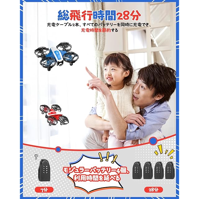 【バッテリー4個&存分に遊べる】総計4つのバッテリーが付属しており、1つのバッテリーの使用時間は7分です。一台のドローンのみに使用する場合、最大28分間遊ぶことができます。また、2本の2in1充電ケーブルも付属しており、4つのバッテリーを同時に充電することができます。充電時間の節約だけでなく、バッテリーの交換も便利です。