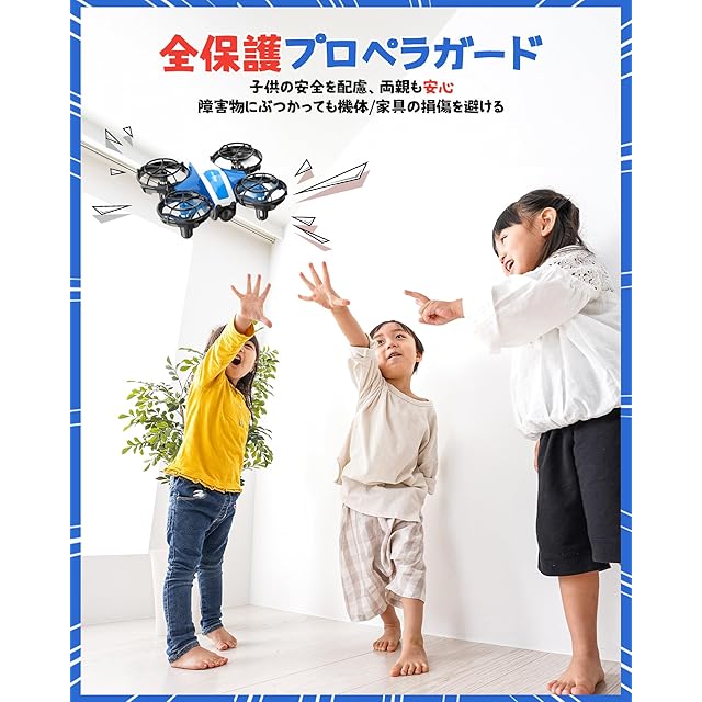 【360°全保護プロペラガード】360°全保護プロペラガードは、障害物に衝突した場合でも、家具や機体、プロペラを保護することができます。また、使用中にお子様の手を保護するので、保護者はお子様に安心して使用させることができます。【100g未満&ミニサイズ】機体はわずか30gで、軽量でありながら、ドローンの登録申請も必要ありません。到着後すぐに遊ぶことができ、非常に便利です。また、サイズも8.2×9×2.7cmの小型であり、家具の多くて狭いスペースや屋内での練習に適しており、収納スペースも取りません。