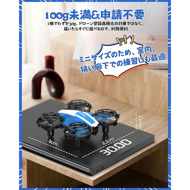 【100g未満&ミニサイズ】機体はわずか30gで、軽量でありながら、ドローンの登録申請も必要ありません。到着後すぐに遊ぶことができ、非常に便利です。また、サイズも8.2×9×2.7cmの小型であり、家具の多くて狭いスペースや屋内での練習に適しており、収納スペースも取りません。