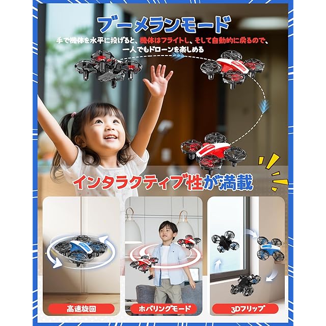 【子供・初心者向け】手投げモード、ヘッドレスモード、ワンキー離陸/着陸、飛行速度切替など、初心者向けの機能が備わっており、初めてのドローン利用でも直感的に簡単に操作できます。ドローン体験を試してみたい子供たちにとって、非常に適したおもちゃドローンです。