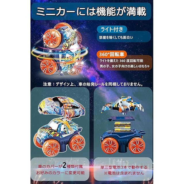 【様々なカスタム方法】車はスイッチをON/OFFにすることで自動で走行したり手動で走行させたりすることができます。専用の車はレール中央にある凸型の部分に噛み付いて進むのでレールを90度直角の壁にくっつけても、逆さまにしても落っこちません!また、車のカバーが2種類付属しているのでお好みのカラーに変更可能です♪