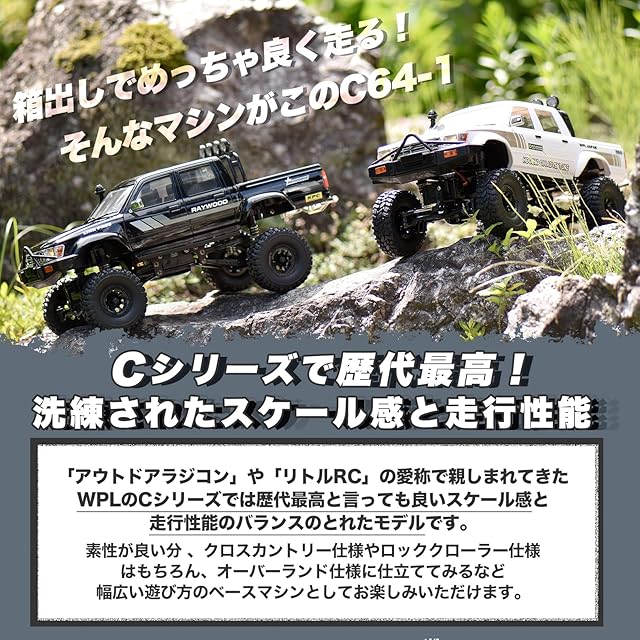 【洗練されたスケール感と走行性能】「アウトドアラジコン」や「リトルRC」の愛称で親しまれてきたWPLのCシリーズでは歴代最高と言っても良いスケール感と走行性能のバランスのとれたモデルです。そういった素性が良い分クロスカントリー仕様やロッククローラー仕様はもちろん、オーバーランド仕様に仕立ててみるなど幅広い遊び方のベースマシンとしてお楽しみいただけます。