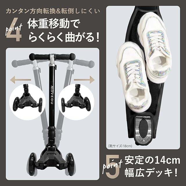【4段階高さ調節可能・方向転換しやすい】軽量かつ頑丈なボディのキックスクーターです。子供の身長により、64cm、78cm、82cm、86cmの4段階に調節できます。適用年齢:4歳〜12歳。車体を傾けることによって方向転換が可能な機構を採用。操作性を高めることで子供の転倒を未然に防ぎます。