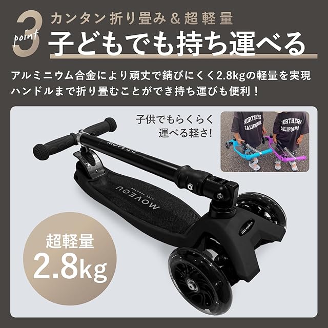 【便利な折り畳み式】本製品は力を入れずとも簡単に折りたたみができるキックスクーターです。持ち運びやすく、コンパクトなので、玄関や室内保管や車に積むのも可能です。軽量 コンパクト 耐久 。それらを加味した最適なサイズ設計を追求しています。本体重量は約2.8kg、耐久性のあり錆びにくいアルミニウム製のヘッドパイプです。